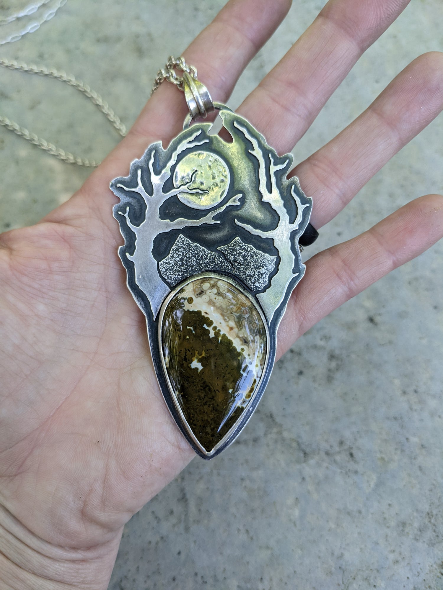 This large asymmetrical pear shaped Ocean Jasper has brown and creamy earth tones, and is set in sterling silver with a hand pierced landscape and full moon poking through winter trees. This one of a kind pendant has a cut out backside to show off the ocean Jasper. The pendant is roughly 4 inches tall and 2 inches wide, on a chunky 24 inch long chain.